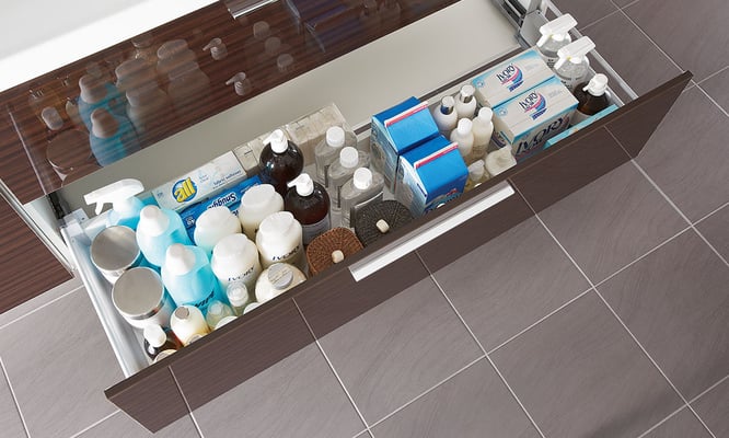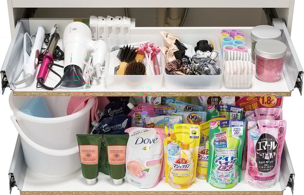 L.C.の収納キャビネットは奥行500mmとコンパクトなのに、床面積が従来品よりも詰め替え用洗剤が10本分も広がり